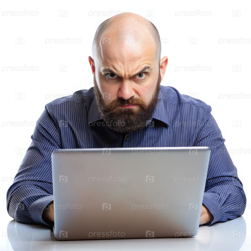 Бородатый мужчина в синей рубашке выглядит сердито на экране ноутбука