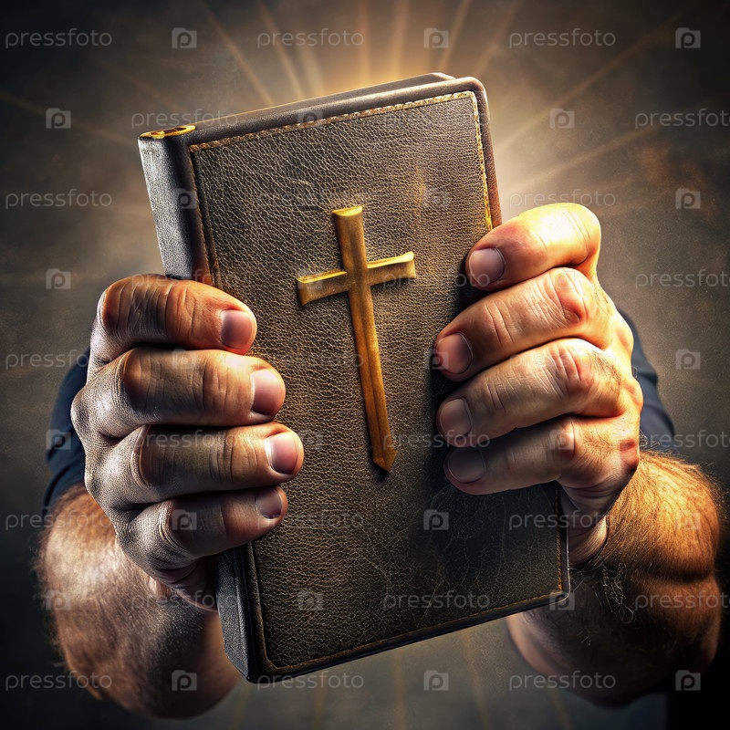 Пара рук, держащих священную книгу с золотым крестом