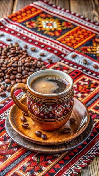 Традиционная чашка кофе с обжаренными бобами на красочном изображенном полотне