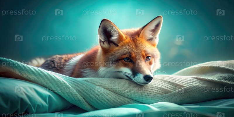 Красная лиса отдыхает на мягком белом одеяле с зеленоватым градиентным фоном
