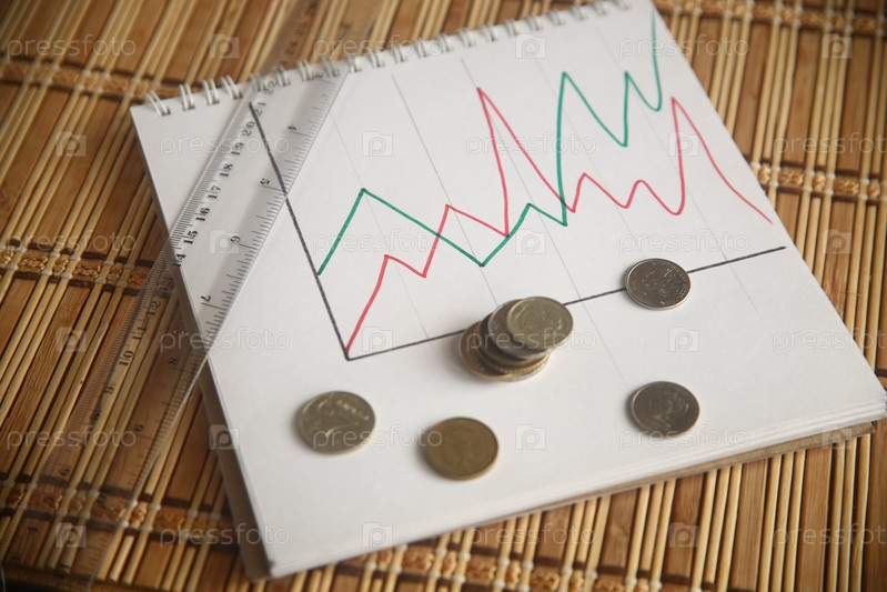 Монеты рубли, евро, линейка и график с диаграммами