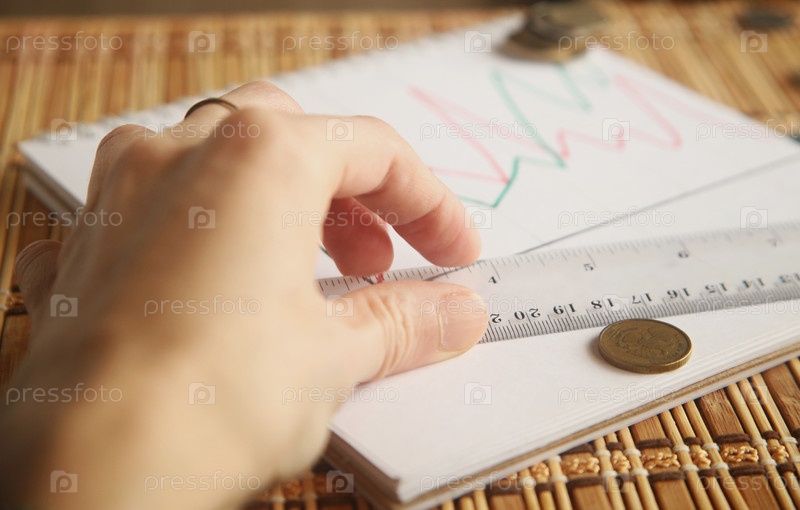 Рука человека с линейкой, графиком и монетами рублями. Бизнес-аналитика