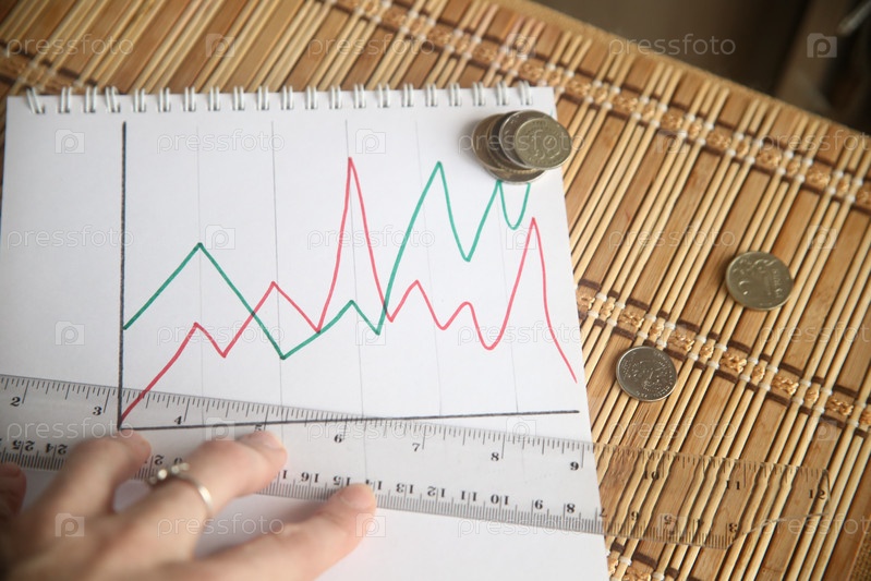 Монеты рубли и евро, рука с линейкой и график с диаграммами