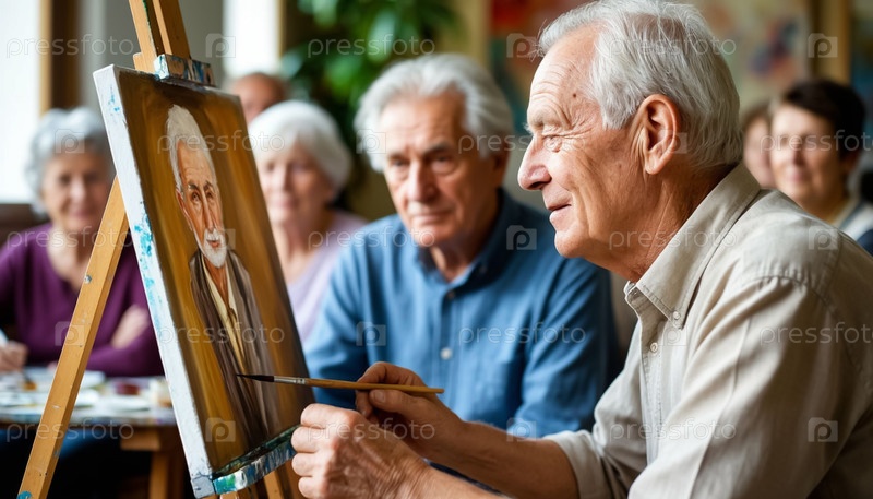 Старший мужчина рисует на эскадрилье боковой вид в художественной студии с группой