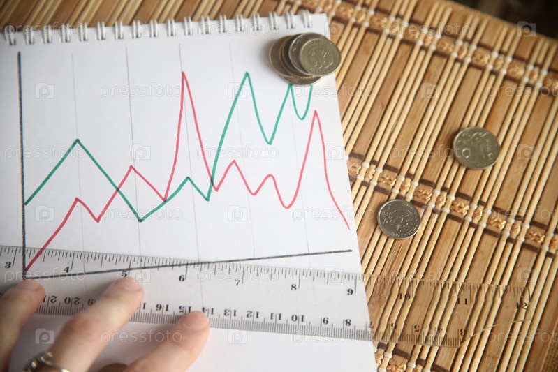 Рука человека с линейкой, графиком и монетами рублями. Бизнес-аналитика