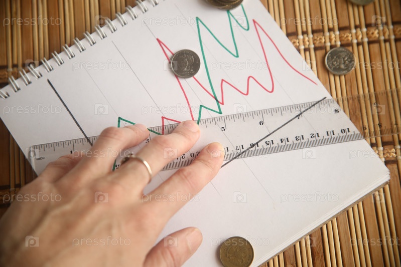 Рука человека с монетами и линейкой над графиком. Бизнес-аналитика