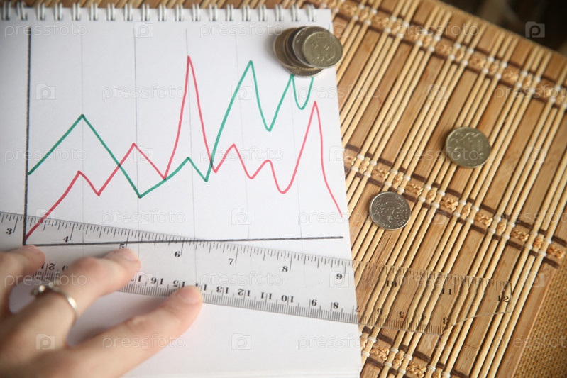 Рука человека с монетами и линейкой над графиком. Бизнес-аналитика