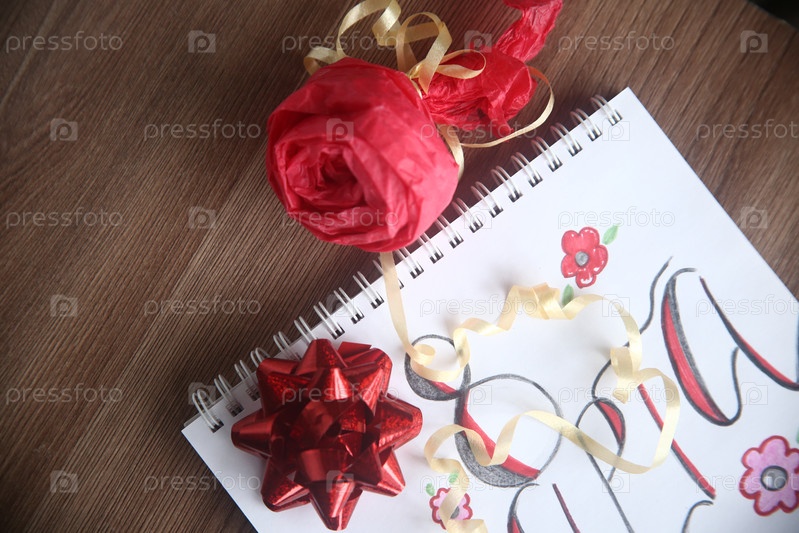Искусственная красная роза, банты в виде звезды и текст с 8 марта крупным планом