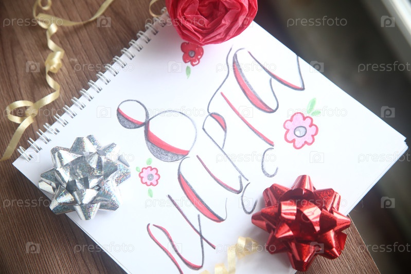 Искусственная красная роза, банты в виде звезды и текст с 8 марта крупным планом