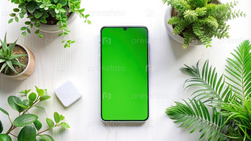 Мокет зеленого экрана телефона на белом столе с зелеными растениями. генеративный ИИ