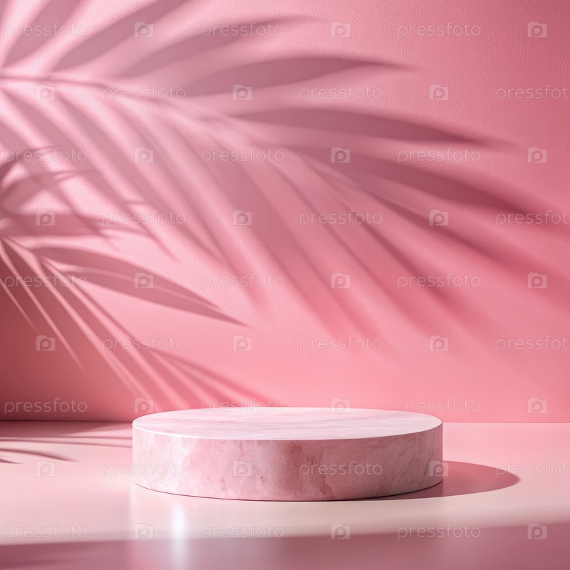 Розовый мраморный подиум с тенью пальмовых листьев на розовом фоне