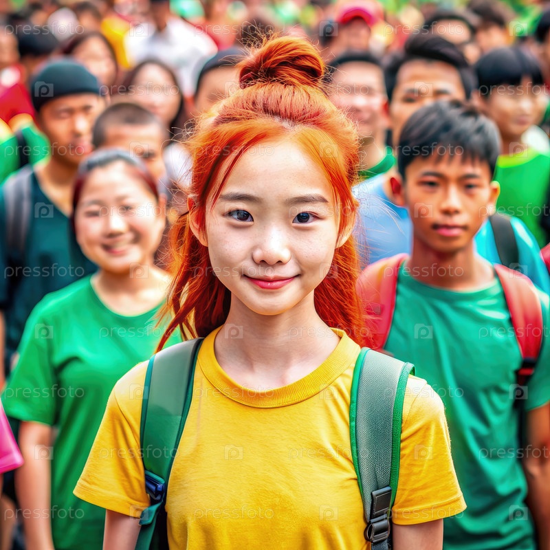 Молодая девушка с рыжими волосами улыбается в толпе людей