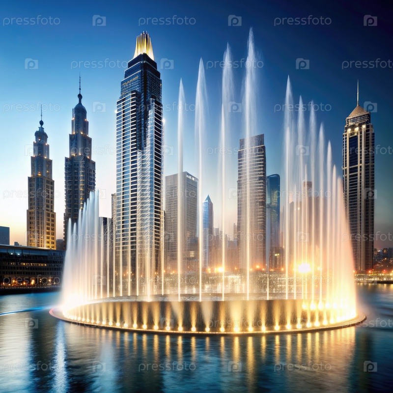 Дубайское фонтанное водное шоу в ночное время с освещенными небоскребами