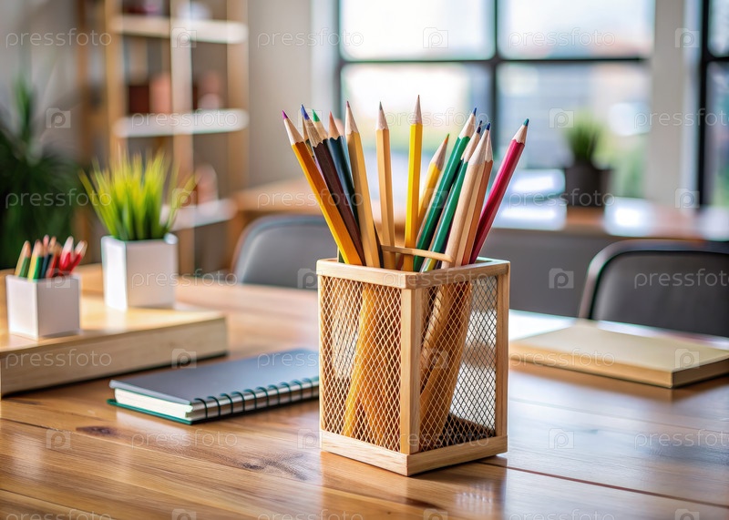 Деревянный карандашник, наполненный красочными карандашами на столе