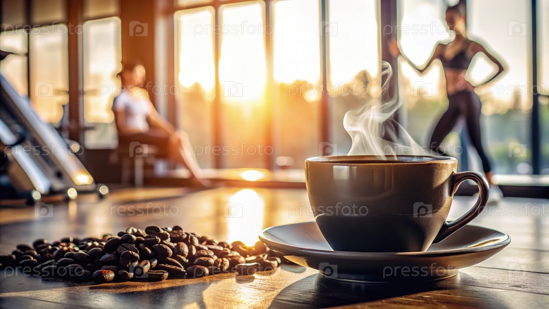 Парывая чашка кофе на деревянном столе в фитнес-студии