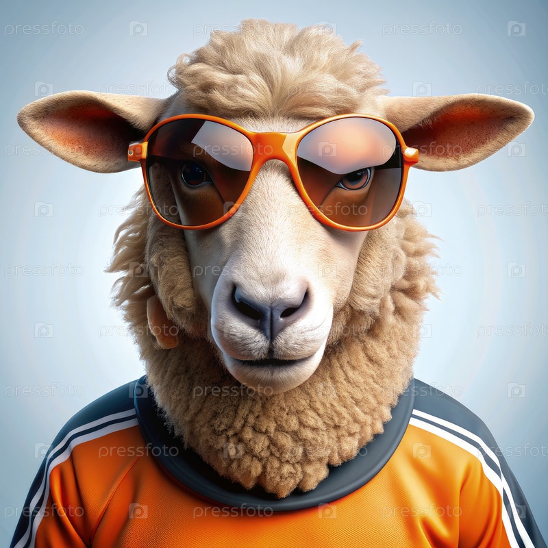 Крутая овца в солнцезащитных очках и оранжевой футбольной футболке