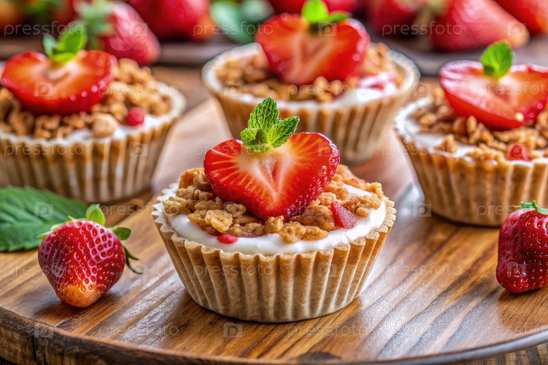 Свежие клубничные и греналовые йогуртные пироги на деревянной подносе