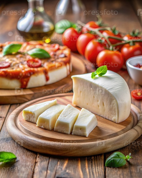 Деликатные кусочки белого сыра на деревянной доске с пиццей и помидорами