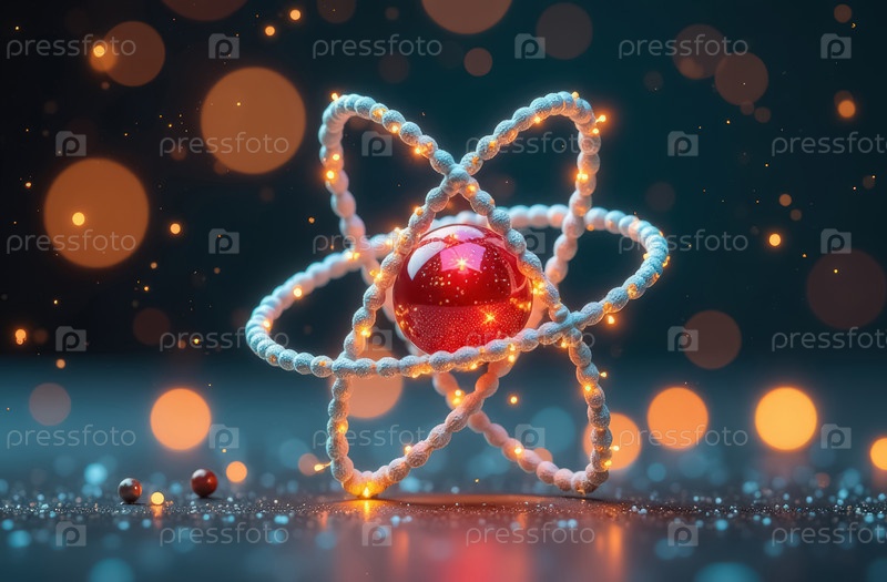 Декоративное близкое изображение атома на темном фоне с боковым и копировальным пространством