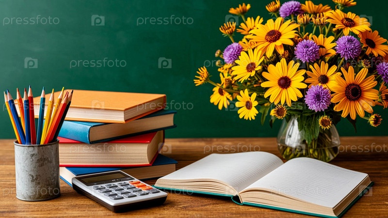 День знаний. Первое сентября. Школьные принадлежности на столе, школьная доска, калькулятор, цветные карандаши и ручки возле классной доски. Натюрморт на фоне школьной доски: букет осенних цветов, учительский стол, школьные принадлежности с калькулятором