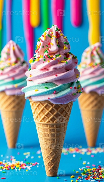 Вафельный рожок с фруктовым мороженным. Яркое вкусное мороженное на красочном фоне