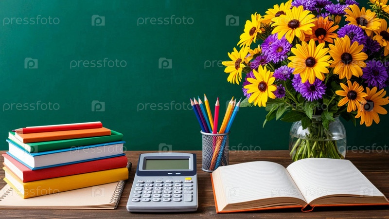 День знаний. Первое сентября. Школьные принадлежности на столе, школьная доска, калькулятор, цветные карандаши и ручки возле классной доски. Натюрморт на фоне школьной доски: букет осенних цветов, учительский стол, школьные принадлежности с калькулятором