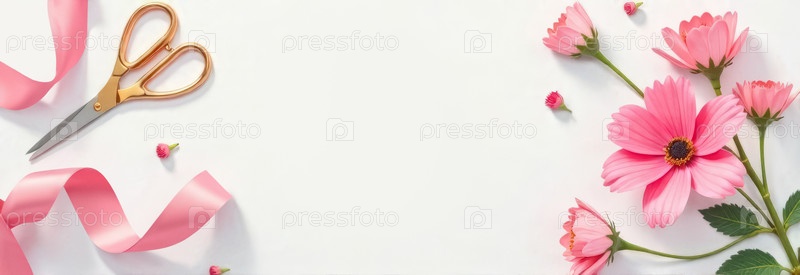 Розовые дикие цветы, ножницы и лента на белом фоне с копировальным пространством
