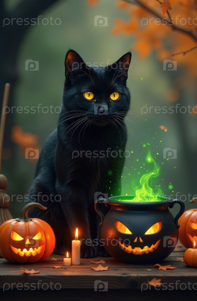 Открытка на Хэллоуин с черным котом, сидящим за столом возле котла из зелья и зловещих тыквен против осеннего леса