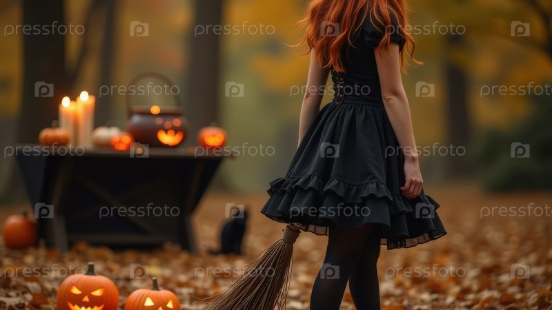 Ведьма в черном платье с метлой смотрит к столу ведьмы в осеннем лесу