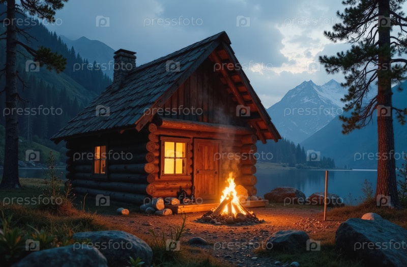 Деревянный дом с горящим костром в форме хижины в лесу возле озера вечером