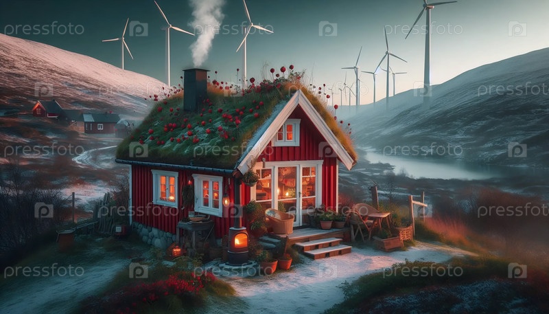 Скандинавский Sod Roof Cabin, AI generated image