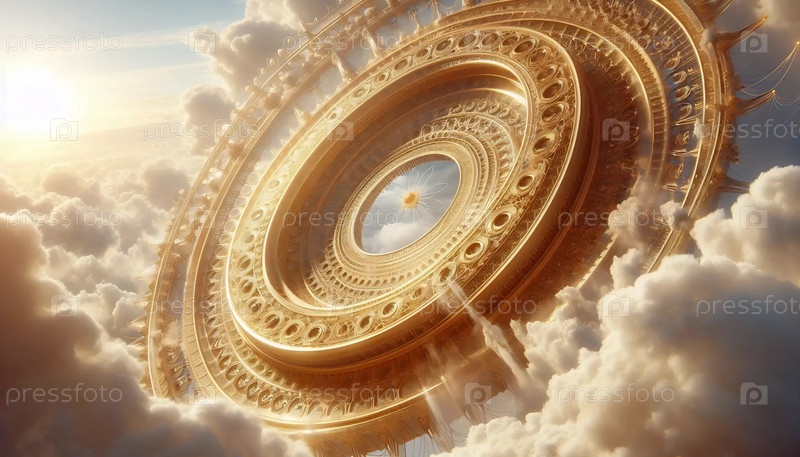 Небесная архитектура с плавающими статуями ангелов и светящимися символами, Ai generated image