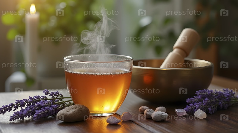 Стеклянная миска с летящим травяным чаем, Ai generated image