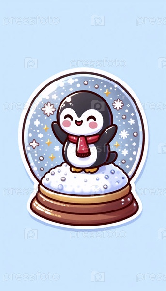 Милый стикер кавайи пингвин в снежном шаре, Ai generated image