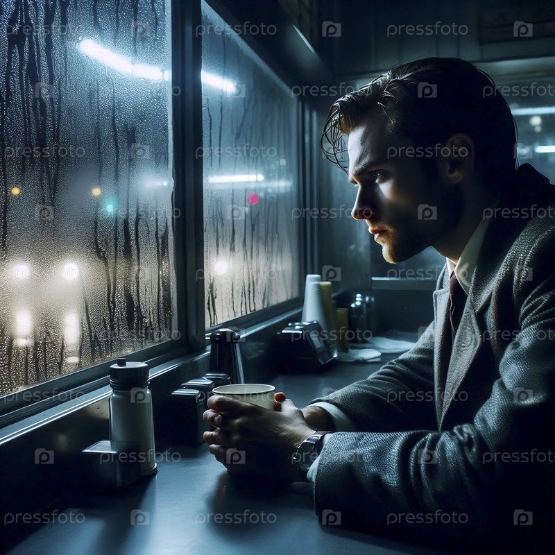 Сцена, вдохновленная ноаром, где мужчина с тревогой ждет у туманного окна ресторана в 3 часа утра, Ai generated image