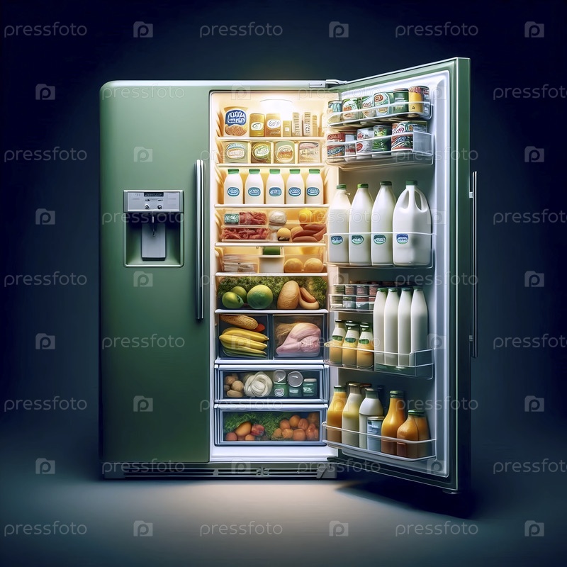 Блестящий, авокадо-зеленый холодильник с идеально организованными красочными упаковками продуктов питания и напитков Ai создал изображение