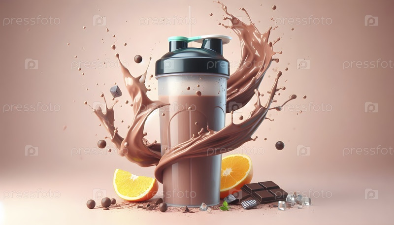Изолированная прозрачная бутылка для шейкеров с вращающимся шоколадным белковым напитком, Ai created image