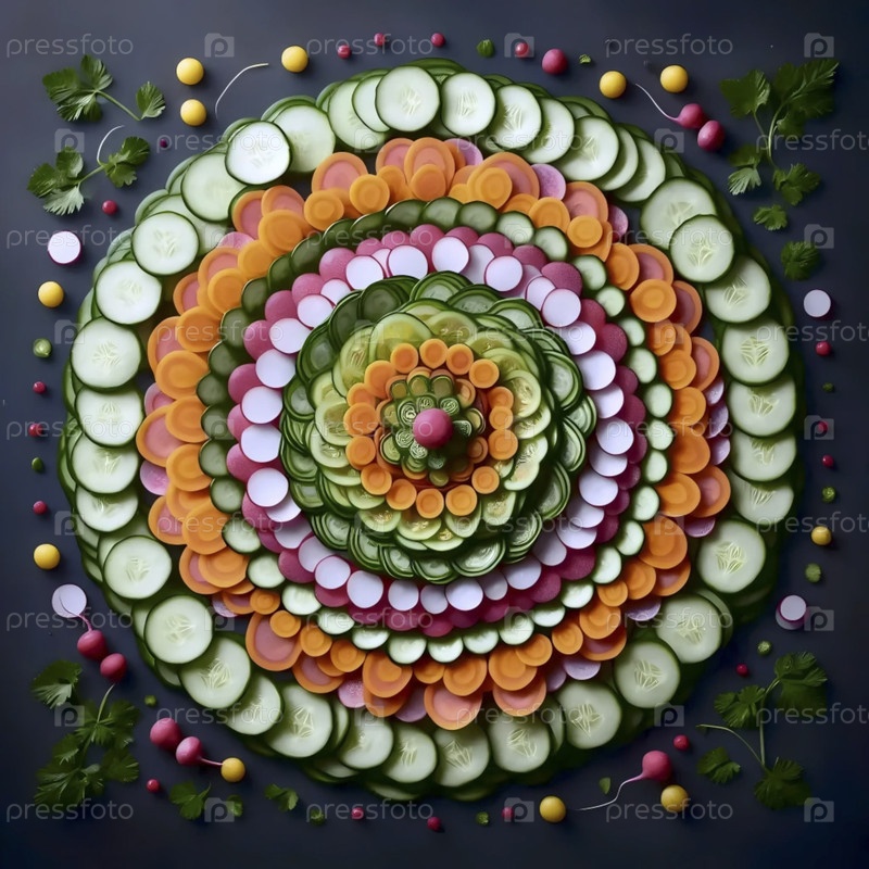 Красочная растительная мандала, созданная из тонко нарезанных редисок, огурцов и морковь, Ai created image