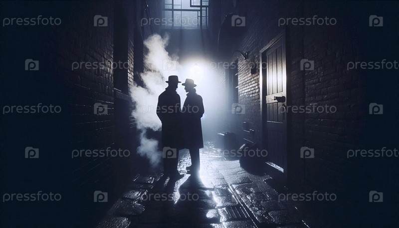 Секретный разговор между двумя мужчинами в шляпах, их лица скрыты под тентом мокрой аллеи, создал изображение Ай
