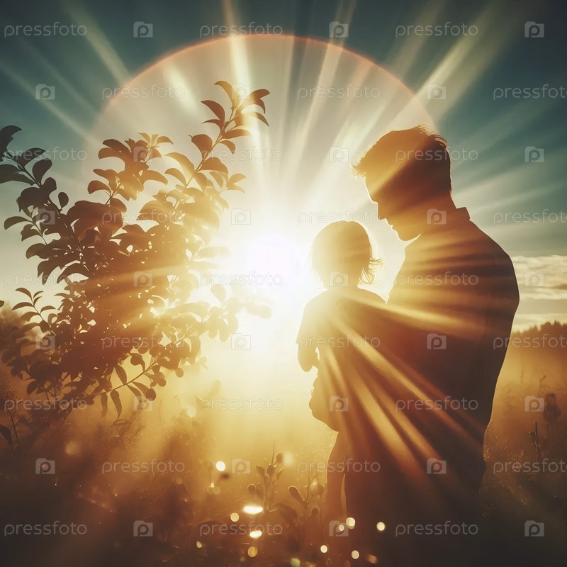 Родитель держит маленького ребенка, чтобы он прикоснулся к листьям большого дерева в парке, освещенном солнцем, Ай создал изображение