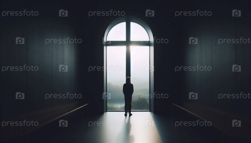 Крестообразное окно с фигурой, глядящей наружу, если смотреть изнутри, Ai создает изображение