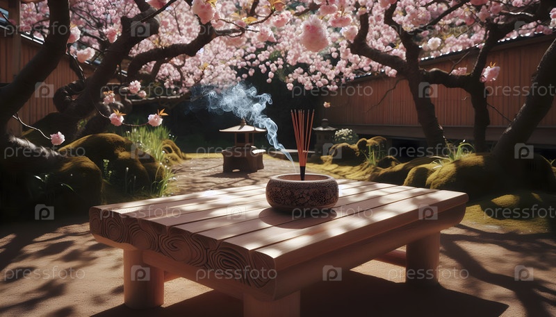 Деревянная скамейка для медитации в саду вишневых цветов, Ai created image