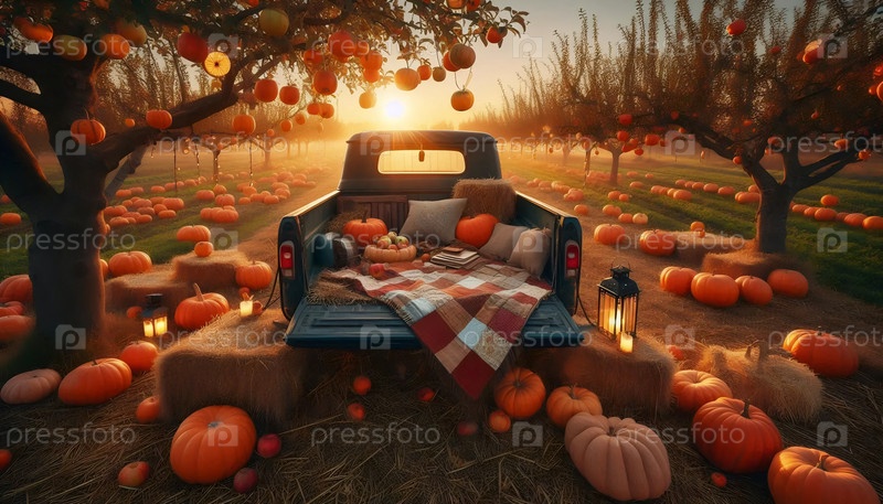 Осеннее тыквенное поле на закате с пикапом, Ai generated image
