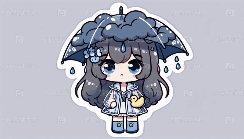 Красивый стикер kawaii с девушкой в дождливые дни, Ai generated image