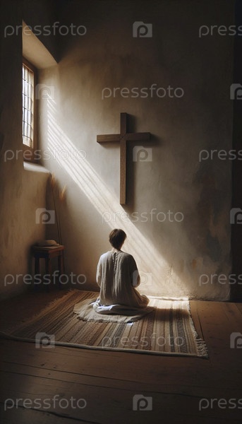 Человек сзади, на коленях перед простым крестом на стене, Ai generated image