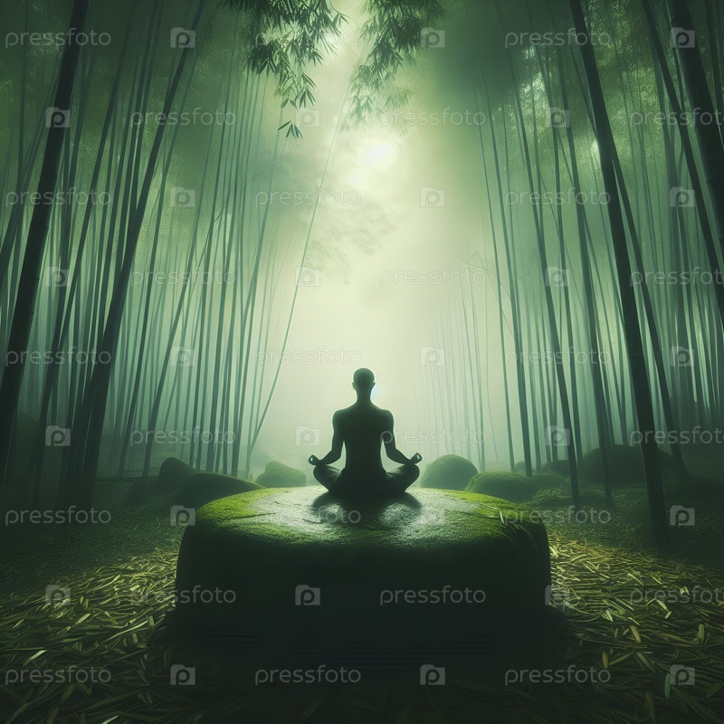 Каменная медитационная платформа в бамбуковом лесу, Ai created image