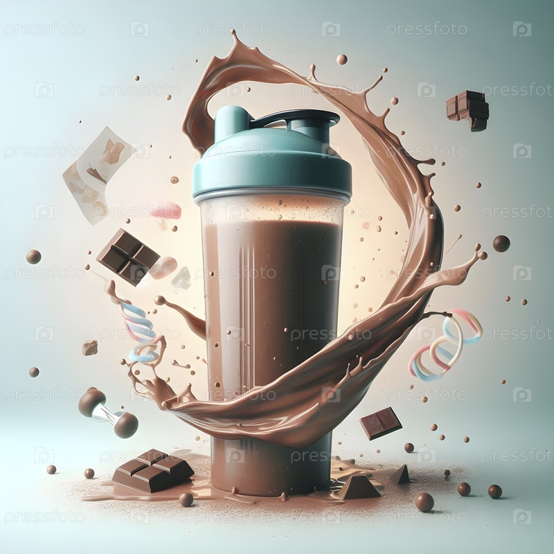 Изолированная прозрачная бутылка для шейкеров с вращающимся шоколадным белковым напитком, Ai created image