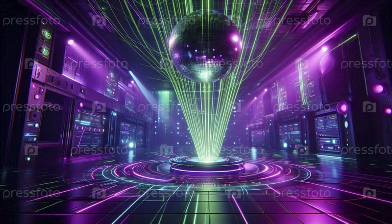 Сцена в ночном клубе с одним гигантским дискотечным шаром, отражающим красочные лазерные лучи во всех направлениях, Ai generated image