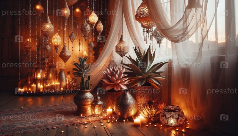 Интерьер в стиле бохо, стеклянные террариумы с воздушными растениями Tillandsia и увлажнителем, Ai generated image