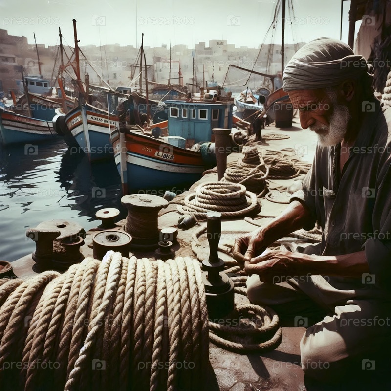 Старый матрос, исправляющий рыболовные сети на ветреной деревянной палубе своей лодки в оживленной средиземноморской гавани, Ай создал изображение